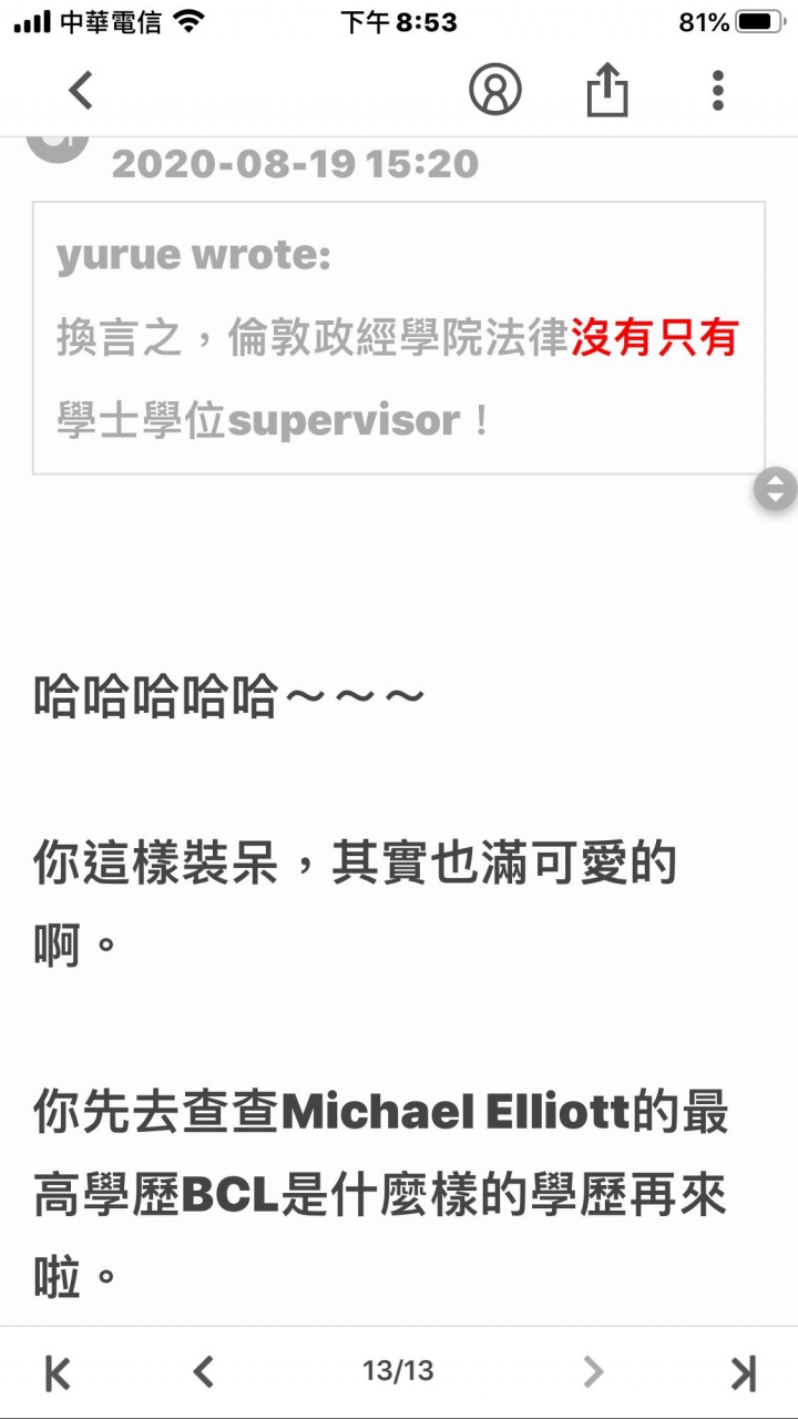 yurue wrote:換言之,倫敦政經學院法律沒有只有學士學位supervisor! 哈哈哈哈哈~~~你這樣裝呆,其實也滿可愛的啊。你先去查查Michael Elliott的最高學歷BCL是什麼樣的學歷再來啦。