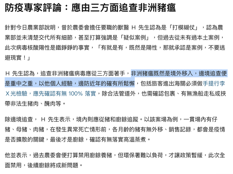 事發地點是梧棲,我是覺得會不會是梧棲漁港有漁民在私下交易或是大陸漁工身上帶菌,再由本國船員帶上岸,因為這個病毒非常頑強可以存活超過10天,也有可能是台中港的船員帶下來的,因為地點離梧棲夜市也很近
