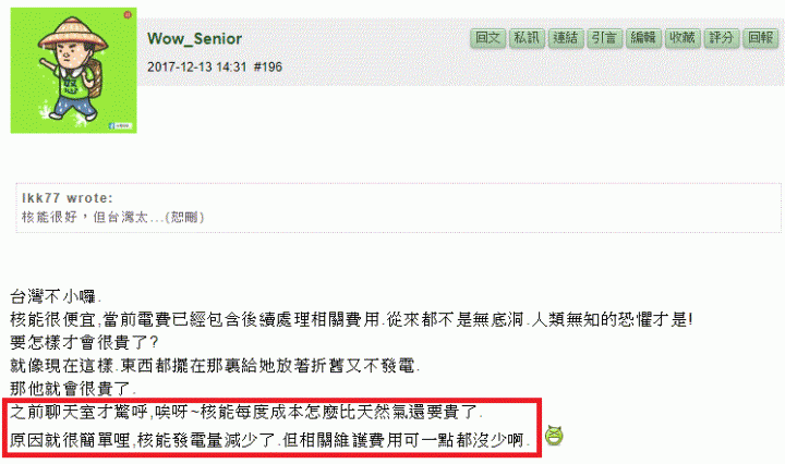Wiselec wrote:我是認為可以逐漸的...(恕刪) 深入探討確實,用核分裂來發電並不是相當好的辦法.真的,但相較於現有的發電手段.他是最好的.老長官,任誰都想要寄望未來有取代核能發電的方式.但當現狀仍然只能寄望未來的時候,你會用更差的處理方式來取代最優秀的那一個!?若你答覆會?那我彷彿就知道為啥FIH會一蹶不振!再來.13.5%很少?限電危機的和平電廠僅供應3%造成815大停電的大潭約25%核能每18個月運轉僅需停爐一次以更換燃料,每次更換約四分之一.就給他算1.5年燃煤只能燒半年天然氣只有7天的量這裡不跟長官提啥存放空間大小,就這些安全庫存.誰長久?誰安全?還沒跟長官堤安全存放的條件喔.那個只有7天量的存放條件要求最高.那個高達1年半的只需要庫房而已,跟我們放手機完成品裝箱沒兩樣.再來副作用問題.長官,請問你看到啥副作用.台灣核能發電超過30年,副作用在哪?沒地方放您是在你家門口就看到核廢料了嗎?以上皆非啊,老長官你怎麼會這種這麼簡單就破解的謠言都輕信呢?世界各國都很頭疼,這點確定的,你就看台灣是在頭疼啥?是真的沒地方放?(FAKE)還是真的沒辦法處理?(FAKE)還是有人卯起來鬧!?(TURE)