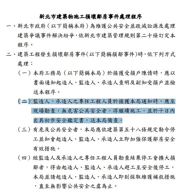 許淑華披露,在柯文哲市長任內,卻擅自修改鄰損鑑定規範,讓都發局碰到鄰損案件時得以減輕責任,只需要通知建商及監造人「自行製作初步安全認定書」,導致建商可以球員兼裁判,自行認定鄰損及安全性!並於111.2.14修正發布實施,