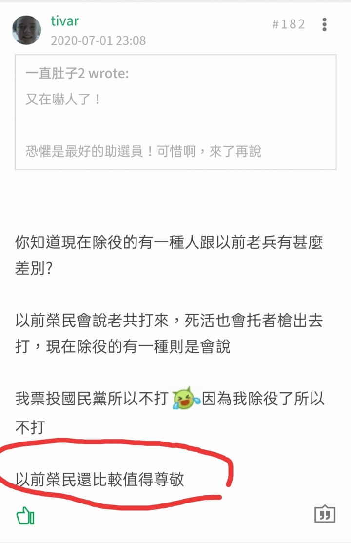 進擊的樵夫 wrote:整天在那當孬孬,說817...(恕刪) 我主張和平共處,跟國民黨原則相同,我也投國民黨以前國民黨執政沒戰爭,如果換民進黨執政就發生戰爭,這問題是誰的問題?民進黨整日在國內搞仇中,選舉更是發揮極致。他綠色執政下發生戰爭,就算要強制我上戰場,我也是投降,或強制擺爛不用全力配合。反正可預計不同心下,一戰必敗。優先死的是你們這些817跟覺青。搞意識型態,族群分裂,抹黑栽贓,追殺到底,還罵人五毛,都是你們搞的,之後要人同心,難了。反正我坐等看這些人,還有綠色政客立委,林9萬,蒙古包,學生會,會不會搶上前線,感動人心。還是學香港那樣國安法一出,個個飛走了。