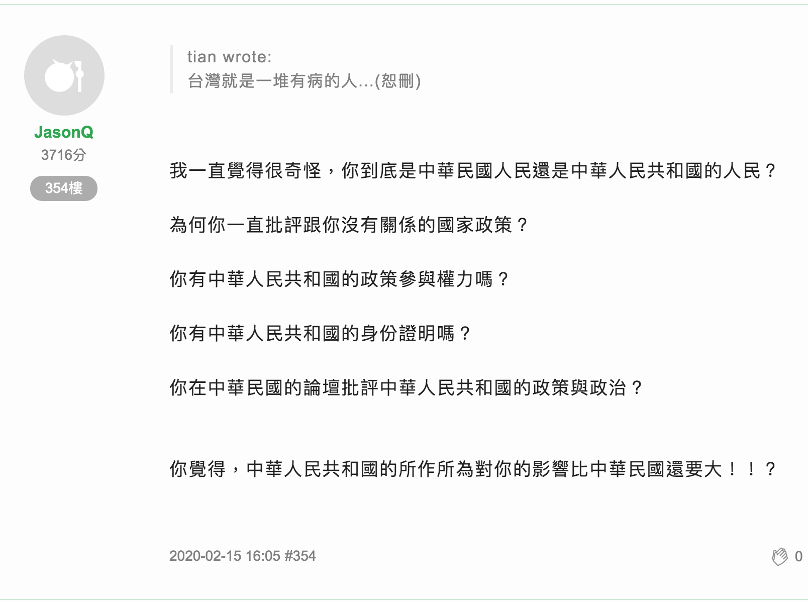 “你在中華民國的論壇批評中華人民共和國的政策與政治?”