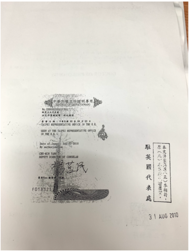 背面有駐英代表處認證章和時任代表處官員簽名。