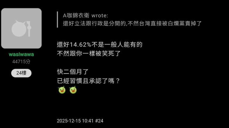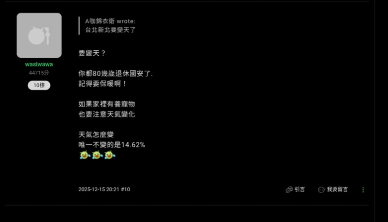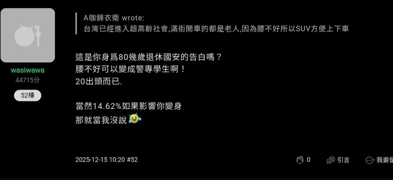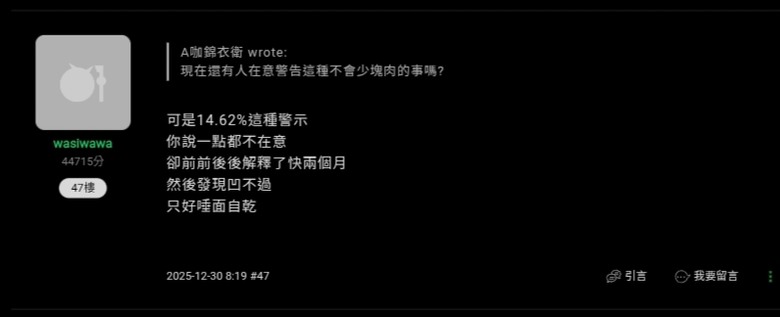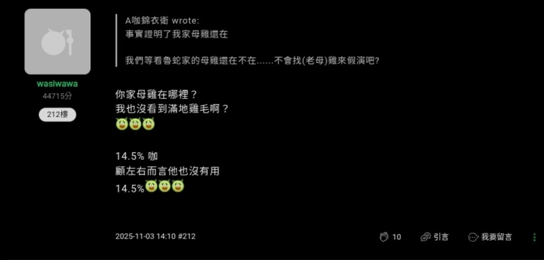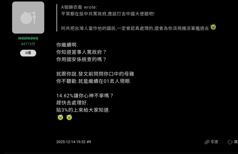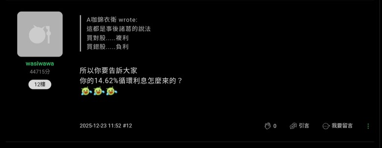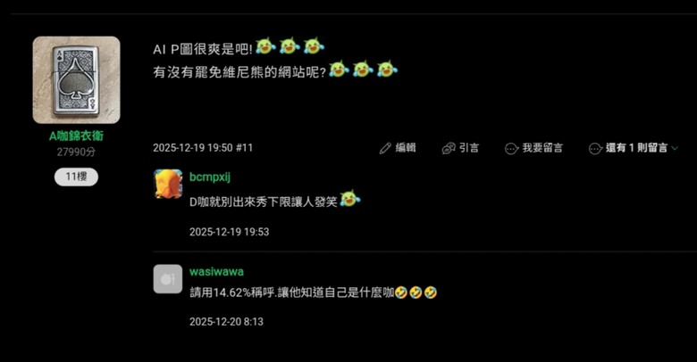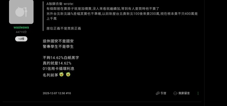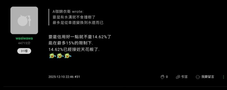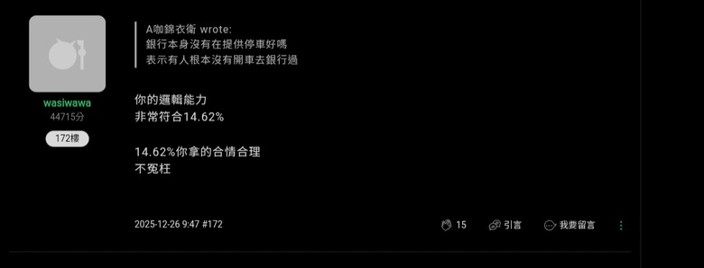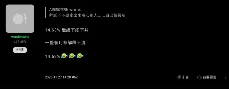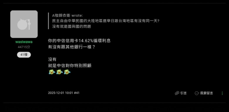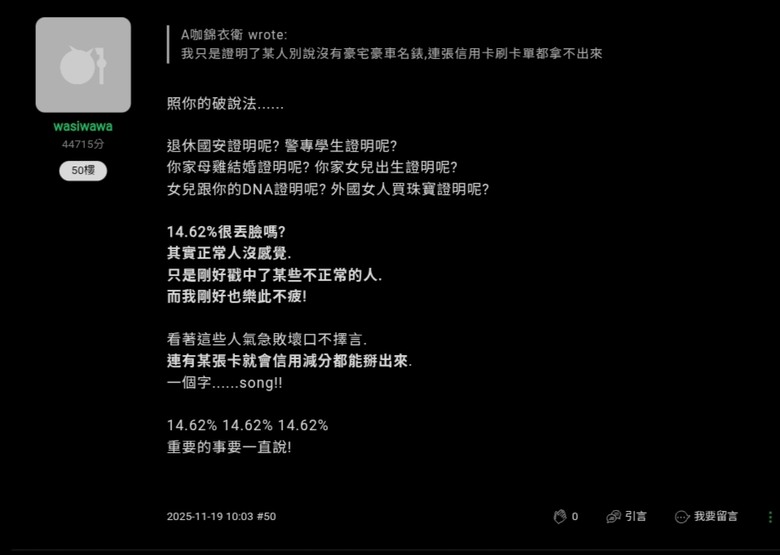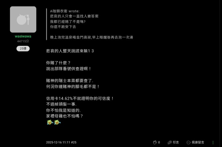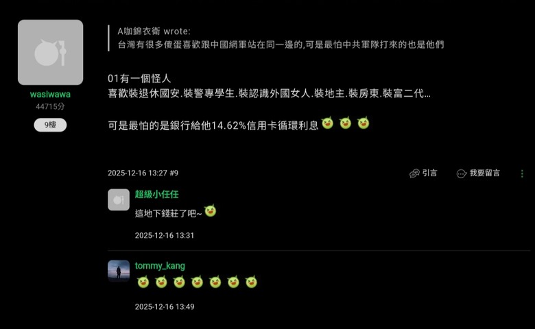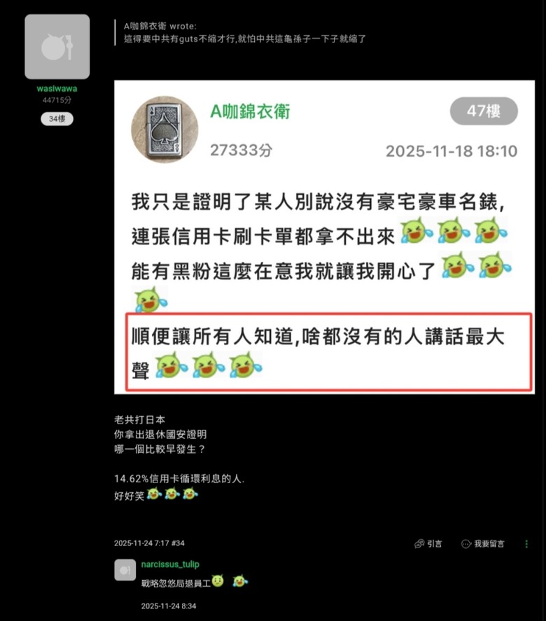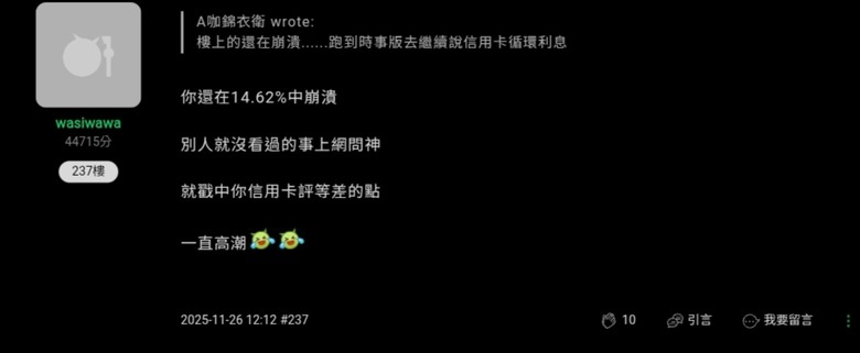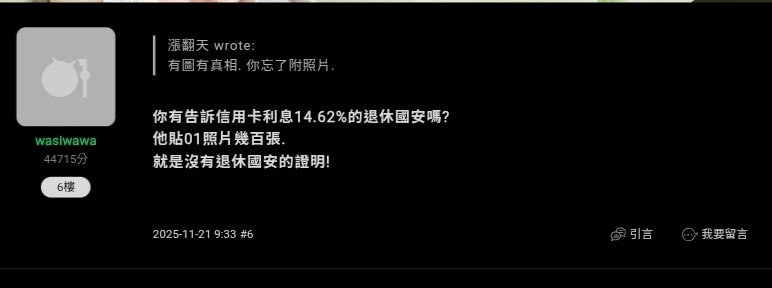 wasiwawa wrote:唯三壞處就是…你的退...(恕刪) 這個造謠的說謊鬼還有臉來嘴砲算什麼?.....根本是造謠的有今天我又跑了幾家銀行繳信用卡,然後我就想到把中國信託新辦卡半年來的繳費單拉出來看,全部循環利率都是7.7%,居然有人可以說我是14.x%還說的很高興,重複上百遍網路上有些人就是會講著講著講不贏就忽然出現阿Q勝利大法也不要第一時間就去拆穿,順著演讓他開心,讓他認為幻想成真,讓他開心的四處宣傳讓大家看看網路如何使人瘋狂,連幻想都跑出來,而且要其他人跟他一起幻想,網路上的你也是已經瘋了嗎?你就是個造謠者造假者
