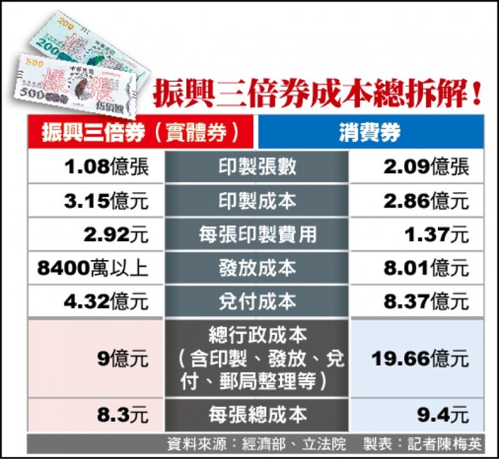 當年發放成本是超過8億元,挺貴的。https://www.president.gov.tw/Portals/0/Bulletins/paper/pdf/6840-1.pdf內政部主管編列 8 億 0,116 萬 2,000 元,其中:(1)辦理名冊、通知單及委託書等編造、印製及發送等作業經費 6,994 萬 4,000 元。(2)辦理發放業務工作人員與協助人力之教育訓練費與工作津貼,及消費券發放所與地方政府辦理發券業務行政經費等 5 億 5,111 萬 8,000 元。(3)委託中華郵政股份有限公司辦理消費券發放費用 1 億 8,010 萬元。 不過時間就是金錢,花8億但能一天發光光,可能民眾觀感還是比較好。