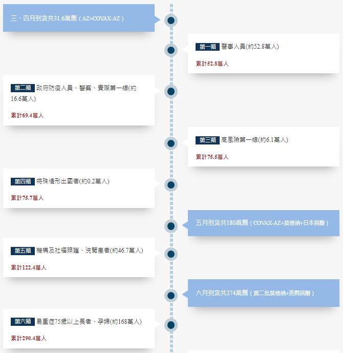當時是第一類=>二類=>三類=>......往下打。疫苗根本沒貨,政府發動各使館找捐贈,靠美日等國捐一點應急。