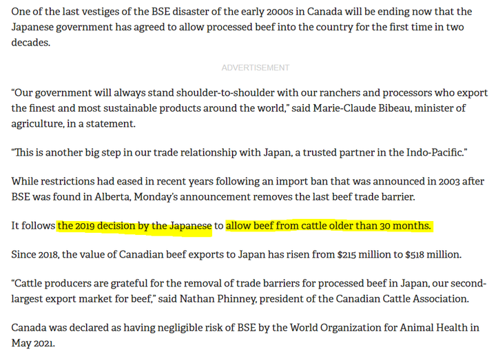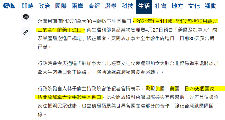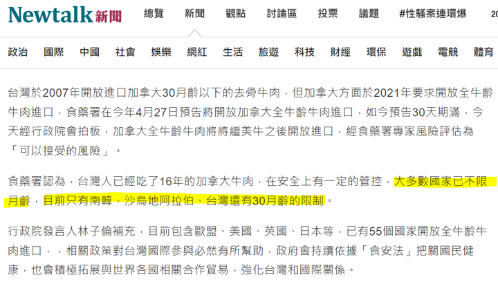 祕雕 wrote:所以意思是韓國還沒有開放全牛齡牛肉進口是吧? 為什麼要等韓國開放,台灣才能開放呢?為什麼不效法日本、歐盟、英國、美國等55個國家呢?日本早在2019年就已經開放加拿大全牛齡進口:即使2021年底發生非典型狂牛症案例,也沒有跟著中國起鬨,禁止進口,當時只有菲律賓、南韓跟著中國禁止,但兩國在不到兩個月內就釐清這是非典型案例,陸續解禁,只剩中國因政治考量繼續禁啊,哈哈哈~既然非典型狂牛症案例並不會導致各國禁止進口,那麼,台灣在2021年1月就已經准許全牛齡美牛進口,要憑哪一種理由禁止全牛齡加牛進口呢?更何況,現在只剩沙烏地、南韓、台灣還有30月齡限制:再就商業實務面而言,進口商即使想進口30月齡以上的牛肉,恐怕也很難找到貨源啊:所以,不管是在醫學、商業的實務面,30月齡都是一個假議題啊,哈哈哈~就像藍、白陣營聲稱開放美國萊豬有多恐怖,結果到現在無論是中央的食藥署邊境抽驗,或是地方的台中市政府市面抽檢,從2021年1月到現在,根本就沒有發現任何一塊萊豬肉啊。美國萊牛進口超過10年,每年各地衛生單位都有抽驗到萊牛,光台中市政府從2021年1月到現在,兩年半就抽驗到157件萊牛,至今有任何醫療單位出現萊劑造成的病例嗎?開放萊豬和全牛齡美牛,讓台、美簽下1979年以來首批貿易協定,開放各國都已經開放的日本福島五縣食品、加拿大全牛齡牛肉,則是移除台灣加入CPTPP的障礙,一再炒作這些假議題,只是意圖妨礙台灣加速國際經濟合作吧?