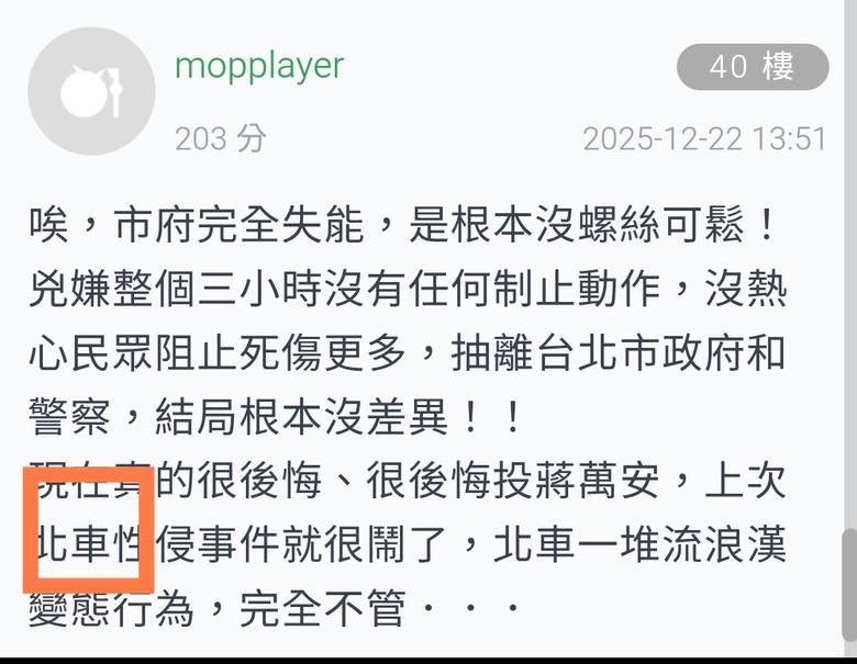 mopplayer wrote:請問長輩,跟中央又有...(恕刪) 拜託.........警政署管各地方警局的地方首長只有白名單的同意權其他等於擺設台灣又不是邦聯 聯邦制 地方司法警察自理這你都不知道 還能睜眼亂洗這新聞在國外留言 一堆阿兜仔質疑台灣警察著麼讓一個恐攻現行犯趴趴走4小時