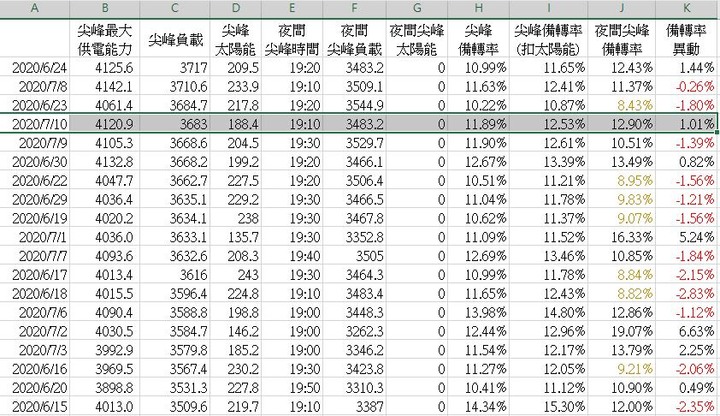 今天日間尖峰用電再創歷史新高而夜間尖峰用電也同步創歷史新高, 來到 3581.4萬千瓦,雖然太陽能發電量大於日夜間尖峰用電差但因分母縮小之故, 夜間備轉率仍較日間微幅上升0.12%(如果把風算入就是下降了)