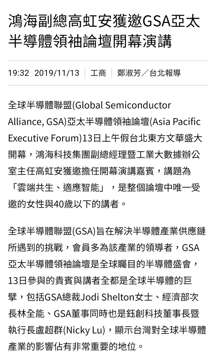 提利昂·蘭尼斯特 wrote:一堆台大畢業的側翼跟...(恕刪) 個人覺得高虹安最強的部分,不是她的那些學歷,北一女台大畢業的人很多。而是年紀輕輕就可以當到鴻海的副總經理!這是非常困難的。漂亮的學歷要經過企業實際的考驗,才可以見證他的學歷含金量與實際能力。高虹安年紀輕輕就通過郭台銘考驗,而成為副總經理,這就證明他的能力實在非常地強!版上面有超過35歲的人,不妨想想,你們同班同學裡面有幾個人35歲不到,就已經當到大集團公司裡面的副總經理? 幾個人能在30幾歲,就能在半導體領袖論壇,進行開幕演講?