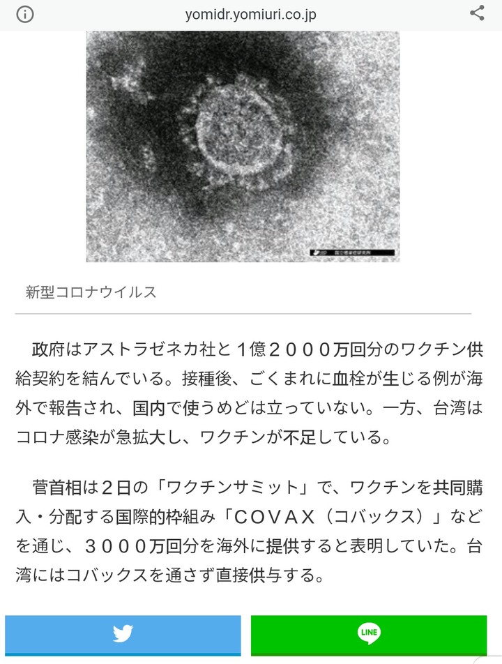 我也懂一些些日文簡單說...就是日本有1億2000萬劑契約(合約)接種後會有少見血栓風險,國外也有報告台灣疫情擴大,疫苗不足首相在2日的會議中宣布將提供3000萬劑,透過COVAX贈送送給台灣的,直接贈送(也就是不經過COVAX分配)如有翻譯錯誤,再請高手協助修正