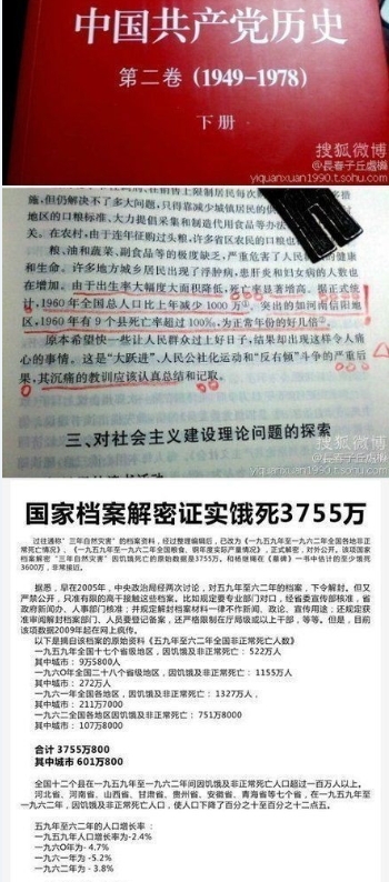 iantsai74 wrote:時間已經是1957...(恕刪) 你說的都只是合理懷疑而已,只是把問題推向不可知,要推翻別人論點就稍欠力度既然你不喜歡分省縣統計人數,那我們用全國總人口分析如何?這篇是我認為一篇分析比較客觀的文章,作者結論為非正常死亡人數大約3500-4000萬,保守估計也有3000萬。中国大陆1959-1961年非正常死亡人数的估算簡單分析一下1964年人口普查時,出生減死亡數居然比總人口增長高了600萬,即中國在極少移民人口情況下無故消失了600萬人!可見原因為前幾年地方政府欺上瞞下把人口寫多了結果到實際普查時就打回原形。但是我認為勇於承認錯誤然後再改正,有則改之,無則加勉才是中國人原本的活法。每天看到隔壁Z大貼文我都會笑,Z大的是心虛的嘲笑,我的是中國開始自信的笑。