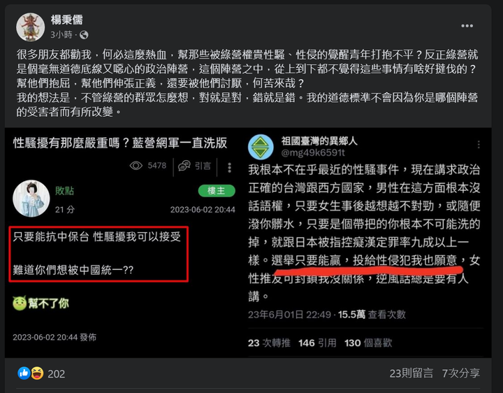 樓主,你出名了~https://www.facebook.com/p/%E6%A5%8A%E7%A7%89%E5%84%92-100001060723713/?paipv=0&eav=AfaeOGmMOtWESjL59Tqmj0UMK82dMPqyS_WnoEzJP5jMnUU7nUiYkaMpK25wnXfBUEo&_rdr性騷擾有那麼嚴重嗎?藍營網軍一直洗版