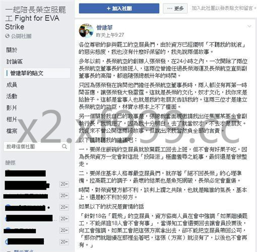 曾建華昨日在臉書社團「一起陪長榮空服罷工 Fight for EVA Strike」發文表示,資方已經擺明「不聽我的就滾」的惡劣態度,因此他提出兩大建議。第一、要保住飯碗的空服員放棄罷工回去上班,但不會有好果子吃,因為長榮資方一定會對這批「投降派」極盡羞辱之能事,最終還是會被整走。 第二、要保住基本人格尊嚴空服員們,就存著「絕不回長榮」的心理準備,拉高罷工的調子,最壞的結果也是魚死網破,長榮必定會重傷。 此外,曾建華還分享自己的例子,說長榮航空的創辦人張榮發曾當面親邀他出任集團某基金會副執行長,不過他婉拒了,「因為我十分明白,去了就當奴才,不去才是朋友」、「這就是長榮的文化,奴才文化,找你來是給臉子」。
