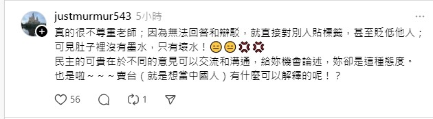Disturbia wrote:只會QB的鄭麗文,EQ也不夠力當初不要答應去不就好了講話超拖~可以加快到1.5倍速聽每次講話都要拖音感覺國民黨的一堆人都很愛喊口號說有多愛台灣但身體都很誠實的去中國面聖搞得每個法案都是利於中國削弱台灣的法案想當中國人又不去領中共國護照 笑死綠憨拿到台灣國身分證了沒不要老是寄身在中華民國