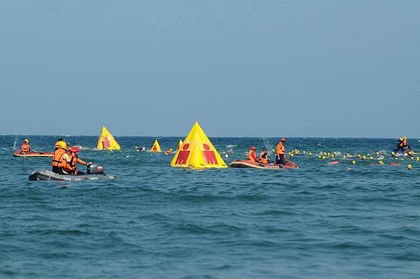 除了盡量避免過度的水中搏鬥,其實我個人鮮少在三鐵場上擔心游泳這個項目。即便游的不是挺快,但大多能在自我預估的限時內完游。只不過在奔至海裡才發現,阻止自己前進的除了各式驍勇的蛙腿外,還有那進一尺退一丈的無聲大浪啊!(連要抬頭定個位都能免費暢飲大口海水,就知道這浪真的不只是小角色。可怕的是在岸邊 standby 這麼久卻完全感受不出來...)