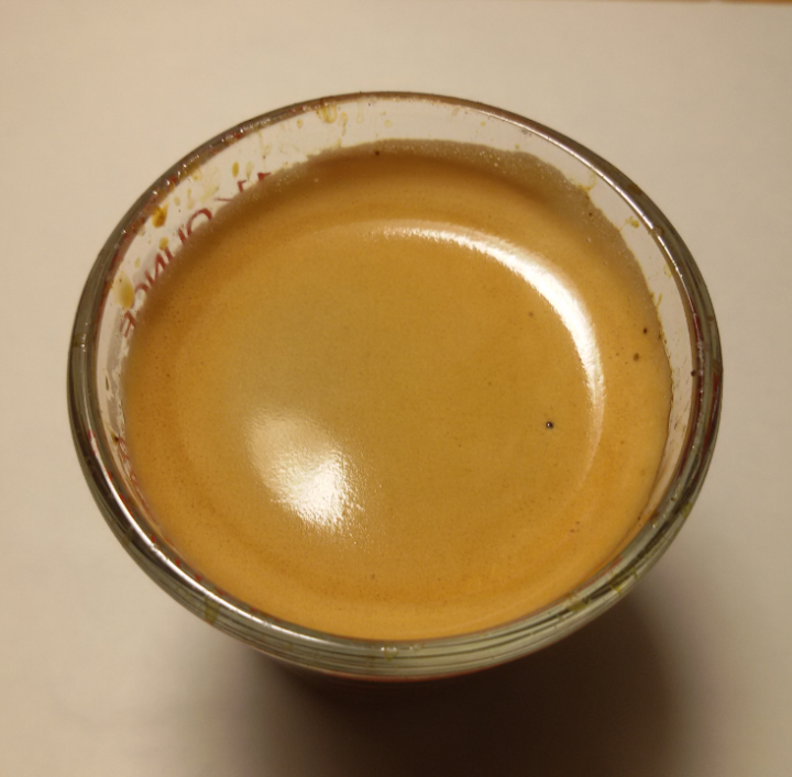 也依樣試了一下,用的是IKEA 6人份摩卡壺和自行車打氣筒,剪了一塊矽膠片當O-ring,打氣筒出氣孔洗了一下直上.原本很怕少了洩壓閥摩卡壺會爆裂或變形,結果因為只有手磨無法建立較大的壓力,水一下子就流光了,只有一層薄薄的crema,不過味道還不錯.