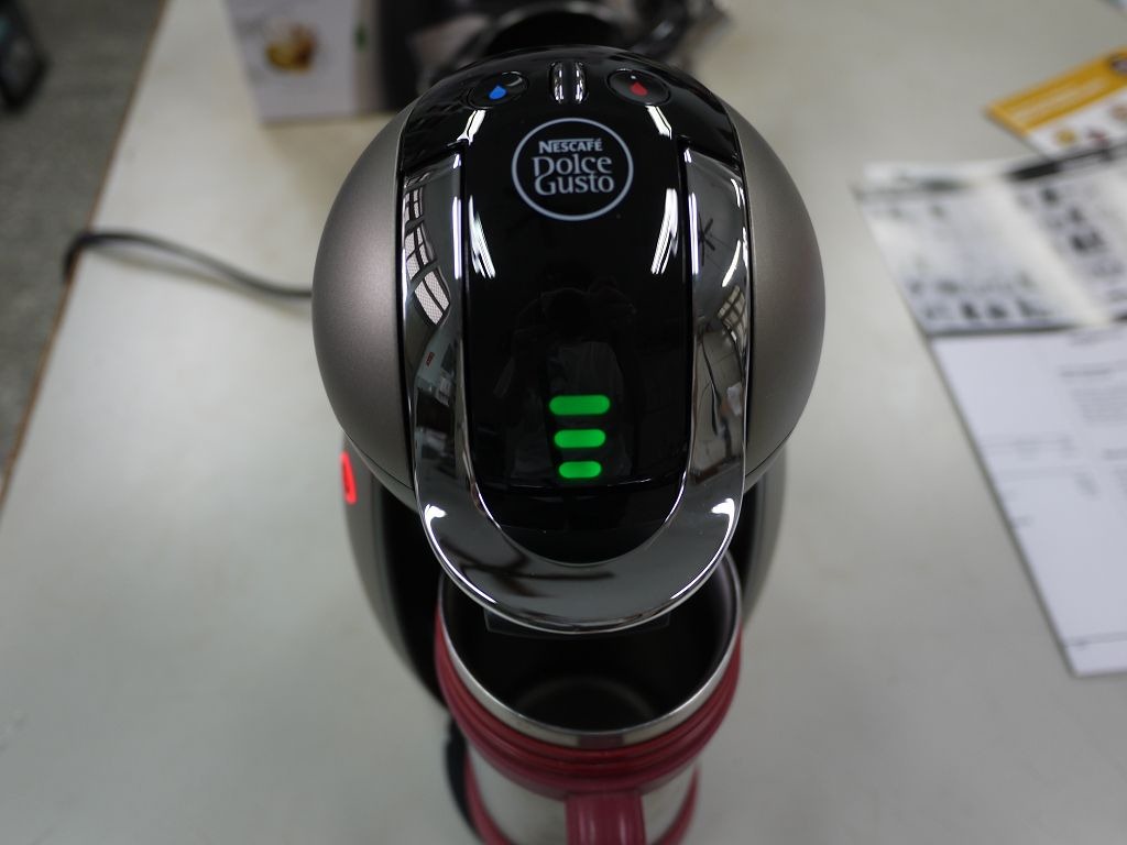 開機了,暖機中。電源按鈕是紅色的,中間水量燈會一顆顆亮起來,整排都亮了以後就開玩機了,大約30秒左右。