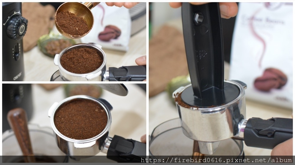 使用方式,是要先裝好咖啡粉,在用壓粉器將咖啡粉壓平。