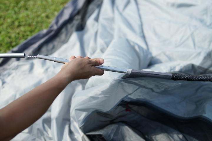 300cm*300cm遮光經典帳搭建教學1.先將地鋪鋪好。2.再將帳篷內帳鋪於地布上。3.內帳門片側邊有黑色織帶為前門。4.內帳營柱為鋁合金原色,一邊組合營柱,一邊將營柱穿過內帳上方的布管。5.營柱每節要確實套緊。