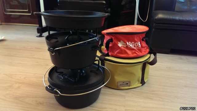看了版大的文章後,本來想買10吋就好,因為12吋太大又太重,今日買了一支鷄想來作烤鷄,發現10吋真的太小,又跑去買版大所推薦的magic IRON555,結果士林那家竟說最後一組昨日晚被買走,就在我沮喪要走時,老板竟說用同樣的價格可以賣給我kovea 12吋三件組的那款,這二個價差快1000元,這樣算我賺到嗎?二個鍋一起烤,一次就可把菜都作好,不用分次烤,這樣也不錯,只不過真的太重了唉!中荷蘭鍋毒太深了,要克制一下了來張二鍋流合照吧!等這週六來試試看吧