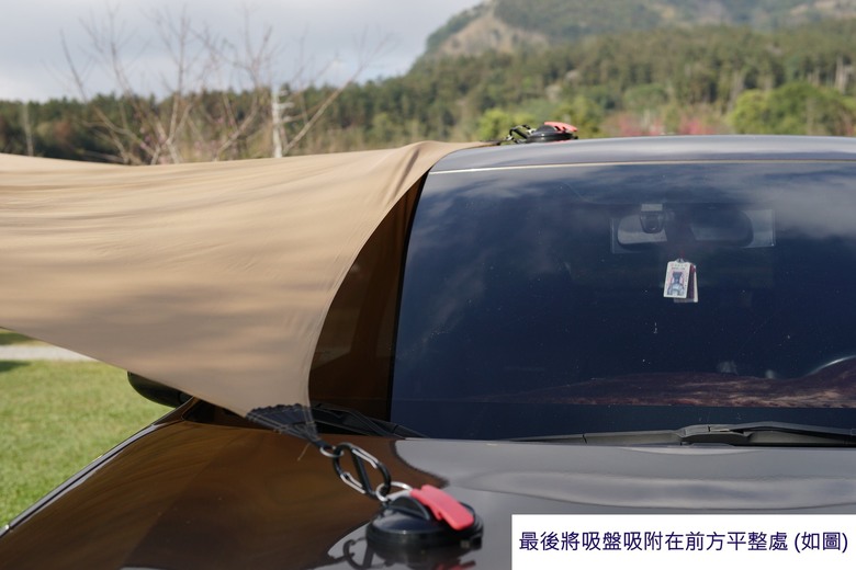 快速車邊帳搭建說明:(一) 搭建所需配件 :(1)JAILORNG 30D 超輕量抗撕裂登山天幕 290X350CM(2)台灣製 JIALORNG TP-A30 彈珠式 伸縮營柱*2支(3)汽車強力吸盤含8字扣*3個(4)ZAZEMU ZR-101 鍛造大黑釘-30CM 台灣製造*4支(5)660CM雙頭營繩*2條(二) 搭建教學 :步驟1 先攤開天幕布,使用汽車強力吸盤含8字扣,扣在天幕布上的金屬配件處,先從後擋玻璃將吸盤吸附在平整處,將吸盤吸附在中間位置,最後將吸盤吸附在前方平整處 (如圖)步驟2 將台灣製彈珠式伸縮營柱調整到您需要的高度,拉繩、打釘、調整營繩所需長度。 (記得雙頭營繩中間點,要先打個結,把營繩一分為二)步驟3 搭建完成