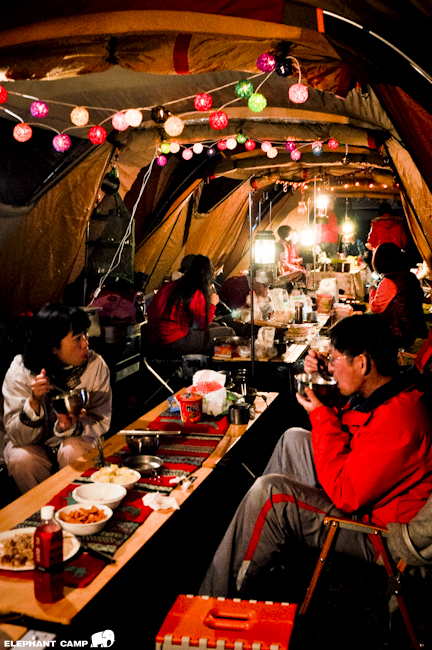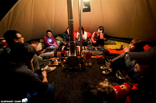 夜晚一堆人圍著爐子在 Tentipi 篷內有說有笑的~