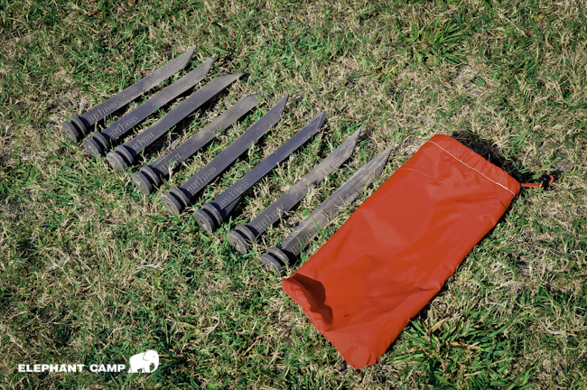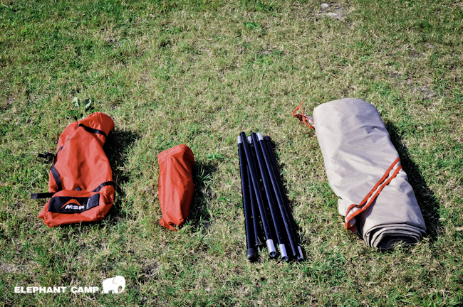整個包裝,由左至右式外袋,營釘&營釘袋,2根營柱,天幕本體