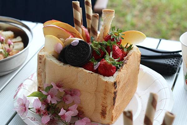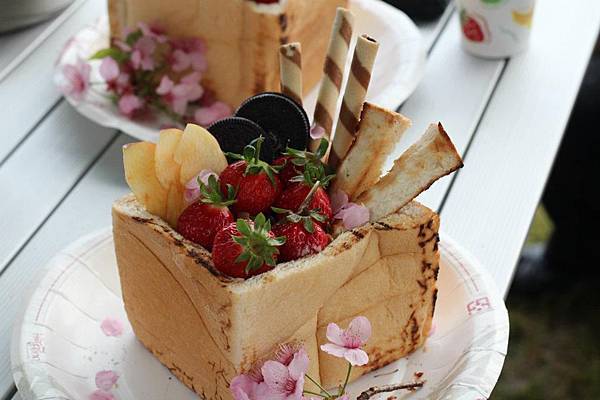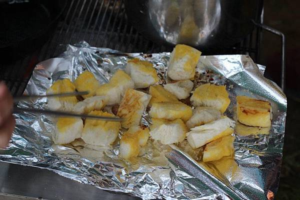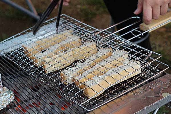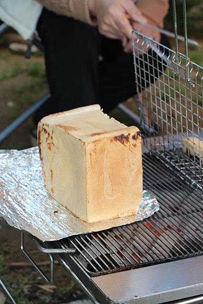 吐司先挖空後,將內餡切成條狀,用炭火先烤酥!!