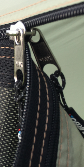 要使水平方向力量可以轉成往下的垂直力量, 可以拉拉鍊後方的zipper puller(拉鍊後面的繩). 因為這個小東西像橡皮一樣有彈性, 所以能將力量往切線方向導, 並且將力量往下轉向. 這樣關門真的順很多. 建議大家可以多利用這個zipper puller 再使用拉鍊時. 我沒想到一般在高階款式的zipper puller 也會出現在turbo tent的入門款式. 這蠻貼心.