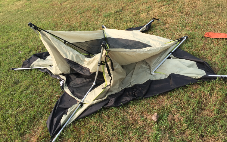 如果按照我這樣子直接推上去後, 雖然帳篷一樣可以張開. 但是從力學的角度去看會使帳篷的腳與關節處多了不對稱性的外旋力量.