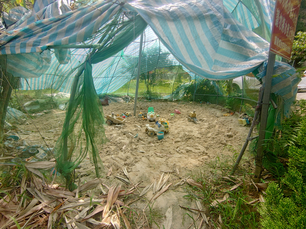 雨棚附有邊布可隔絕些許聲音和光線,也有一些舊桌椅可運用