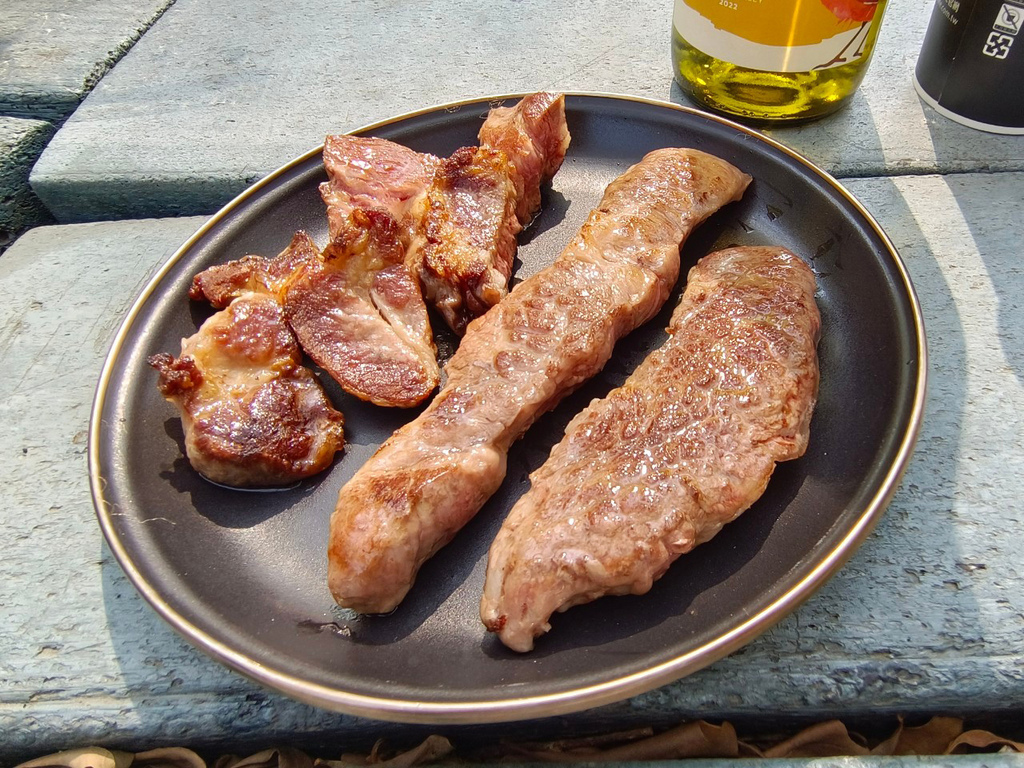 兩面微焦、帶豐厚油脂的PRIME無骨牛小排以及伊比利梅花豬肉排