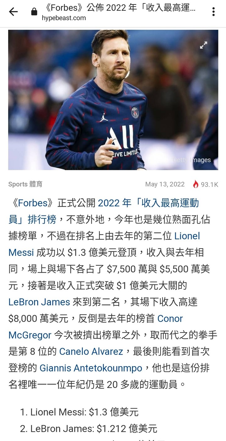 運動員年收梅西排第一酸民別崩潰https://hypebeast.com/zh/2022/5/forbes-worlds-10-highest-paid-athletes-2022-lionel-messi
