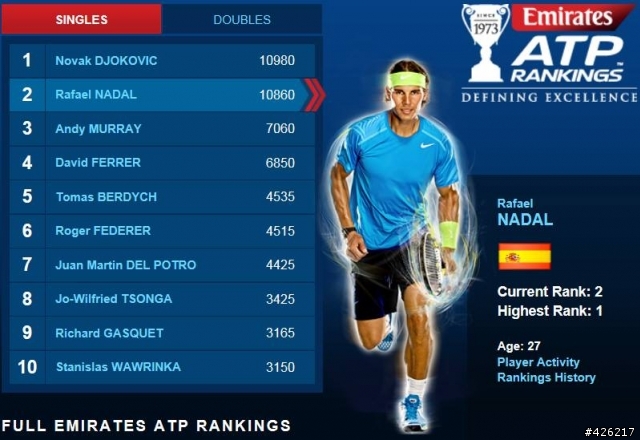 尤其他今年在硬地的戰績是全勝 + 八座法網紀錄, Rafa很有機會拿下史上最佳的榮耀; 目前他跟Djokovic只差120分!! 十月份的上海大師盃和巴黎室內網賽, Nadal如果再度拿下可以重返第一~~Rafa在2013男單冠軍獎杯的數量是最多的[四大滿貫]Roland Garros, US Open[九大系列賽]Indian Wells, Mutua Madrid Open, Internazionali BNL d'Italia, Coupe Rogers, Western & Southern Open - Cincinnati[其他ATP賽事]Brasil Open 2013, Abierto Mexicano Telcel, Barcelona Open