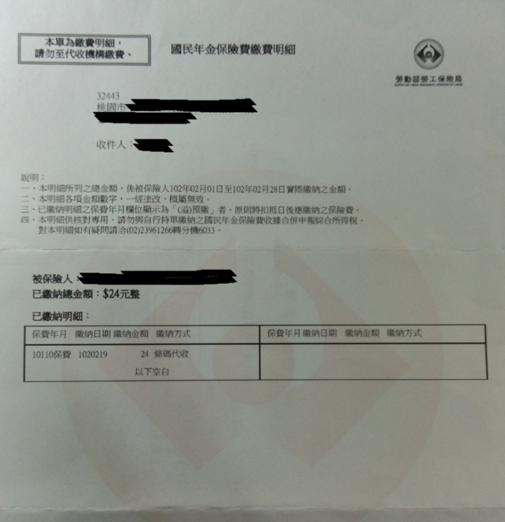 這中間只有一個月失業 所以只繳了一個月的國民年金費用