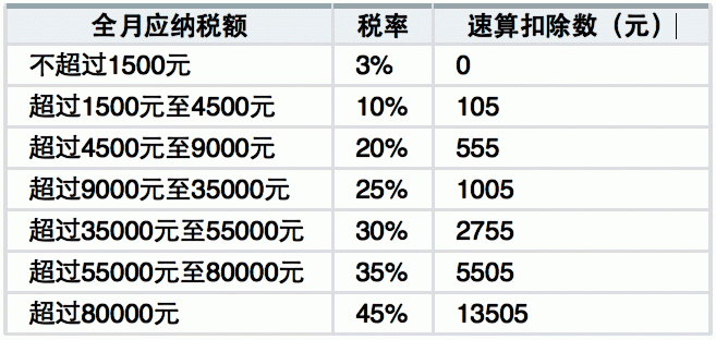 kevinant2 wrote:你好,小弟來自台灣...(恕刪) 關於稅率我替樓主回答一下吧,中國的個人稅起征點是3500元人民幣,3500元是指扣除五險一金后金額稅率是階梯徵收的,具體參考下面稅率表假設您的月工資為10000元,工作地點是北京(這個城市的五險一金個人繳納標準是養老保險8%、醫療保險2%、失業保險0.2%、住房公積金12%)。那麼:應納稅額=10000 - 10000 x (8% + 2% + 0.2% + 12%) - 3500 = 4280(元)查上表可知,與4280元對應的稅率和速算扣除數分別為10%和105,因此:個人應繳所得稅=4280x 10% - 105 = 323(元)個人工資賬戶收入工資7780-323=7457元公積金收入2400元和個人繳納醫保200元,不進工資銀行賬戶,分別進其他兩個銀行賬戶!每個省根據經濟發展狀況繳納五險一金的比例和政策會有不同,但個人所得稅率全國是一樣的,總之,挺繁瑣的!