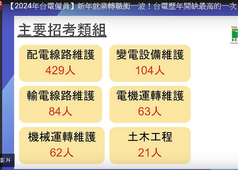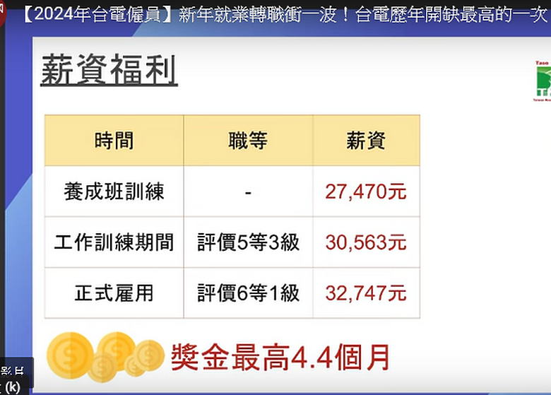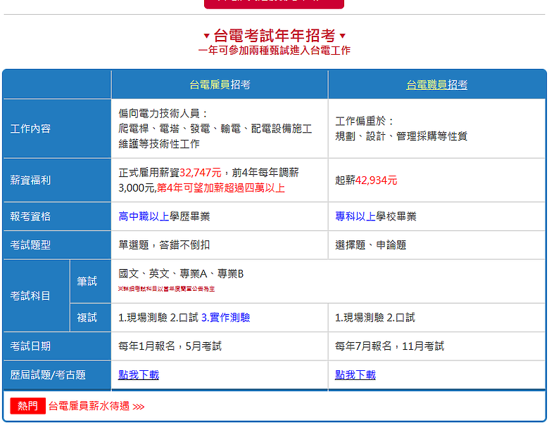 【台電雇員招考】2024年考試日期、科目、錄取率與工作內容,高中職畢業就能考 ■ 台電雇員/職員招考屬於國營事業工作有保障,而且台電福利更是國營事業之首,休假多,每年年終獎金都是3、4個月起跳,還考績獎金,每年都會調薪1-2%,最高可以調到70K!台灣電力股份有限公司113 年度新進僱用人員甄試簡章112 年度新進僱用人員甄試各類科報名人數及錄取率