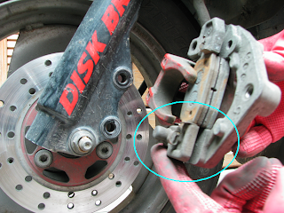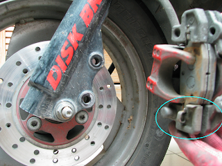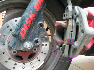檢視至此, 自己主觀地認定, 碟剎來令片密合時, 仔細檢視那密合處的"圓點"來令片的"厚肉"程度, 是否已磨平到"鐵片"處, 即可知曉~ 碟剎來令片是否該更換"新品"!!