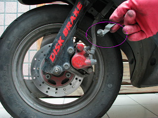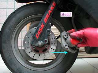 (step2)移出方向操作時, 請注意~ 剎車油管還連在剎車卡鉗, 別過於大力扯動, 致油管裂損!!