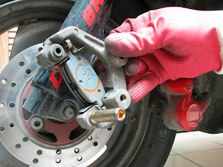 放鬆旋轉取出這顆"碟剎片的接合螺絲", 轉動好久發覺~ 奇怪?! 怎麼都抽不出!! 原來有橡膠套緊緊地套住這顆螺絲.., 請用點力抽出即可~~