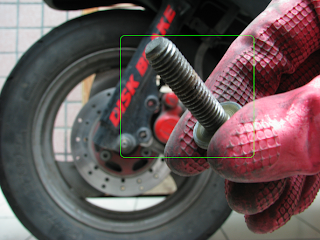 呼叫~ 12號六角套筒~ 接著, 放鬆"碟剎片的接合螺絲" (至此, 手工操作者會知道為何要選用"延長套筒桿)