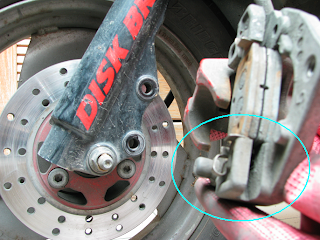剛才, 自己手賤不小心碰觸到"碟剎來令片", 致中間那2片密合在一起, 怎麼辦?? 復原處理方式: 拿支鈍頭的一字起子往密合處擠入作撐開, 就可以搞定!! 其實拿剛才拆出的~ "剎車油管固定架螺絲"的鐵片, 就可以當作一字起子功能使用操作。