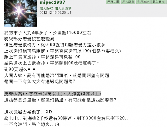 mipec1987 wrote:太誇張吧你的傳動是接近原廠的重 什麼都換了今天再檢查一下還有火星塞沒換這個會影響很多嗎?我也只是想要超車的時候用而已平常都是騎40-65在代步用所以現在該怎辦...今天跑了60公里耗兩格油
