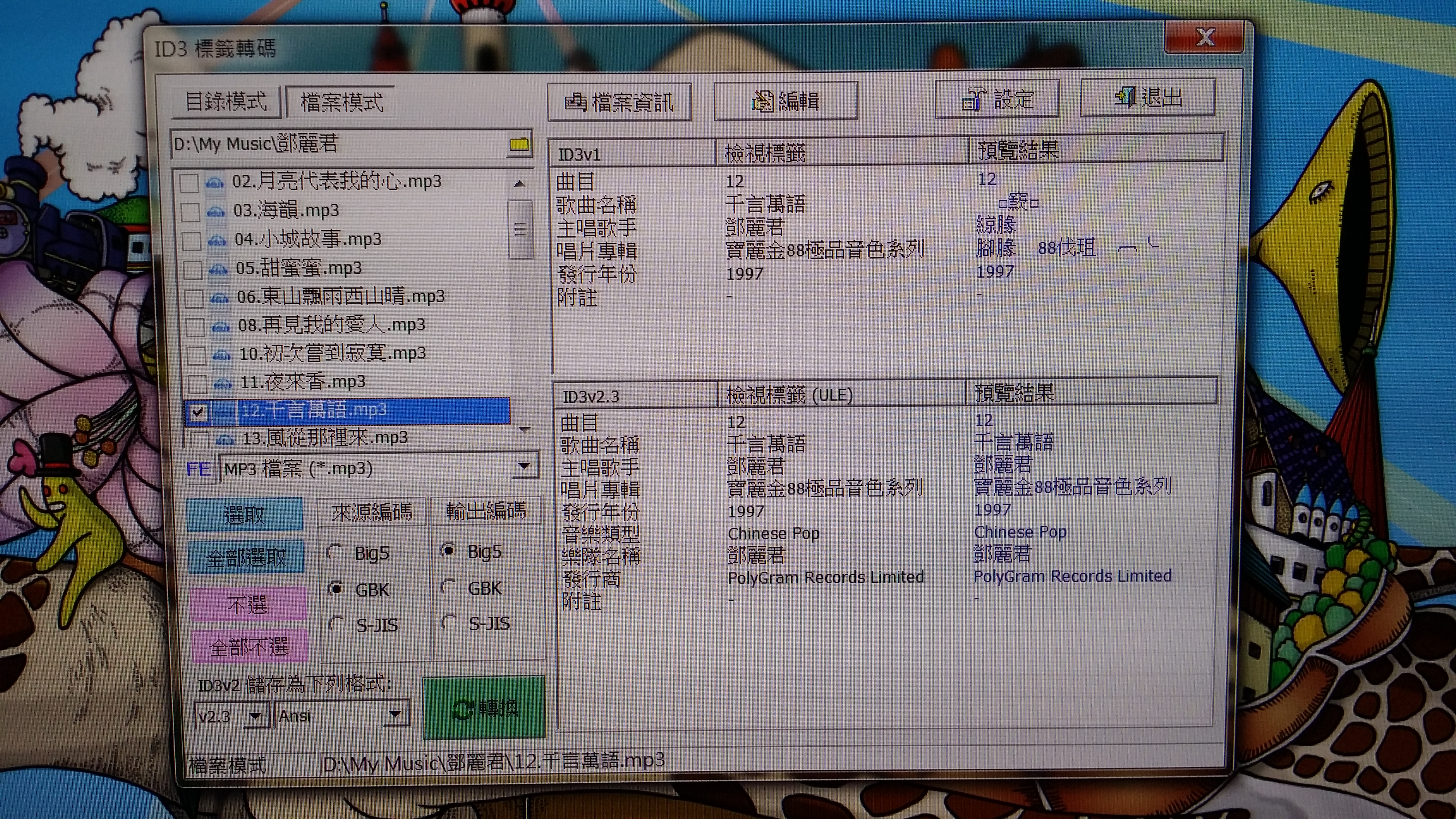 nk00411688 wrote:感謝大神 realmax 大大幫解了先說怎麼解決的先用 圖1 開程式選音頻轉檔選 ID3標籤 後進去找你要改的音樂圖2 千言萬語那 realmax大神說的就是ID3V1 上面那個檔有亂碼 所以去點上面編輯進入 圖3圖3 把左上方的 ID3V1標籤 打勾用掉 然後再改下方 ID3V2儲存方式那改 V2.3 .Unicode 後按下方儲存再點右上方的X跳出圖4 就會看到圖2上方 ID3V1 不見了 然後記得再下方 來源編碼 跟輸出編碼都改Big5轉換這樣就成功了 先備份,待會再來試