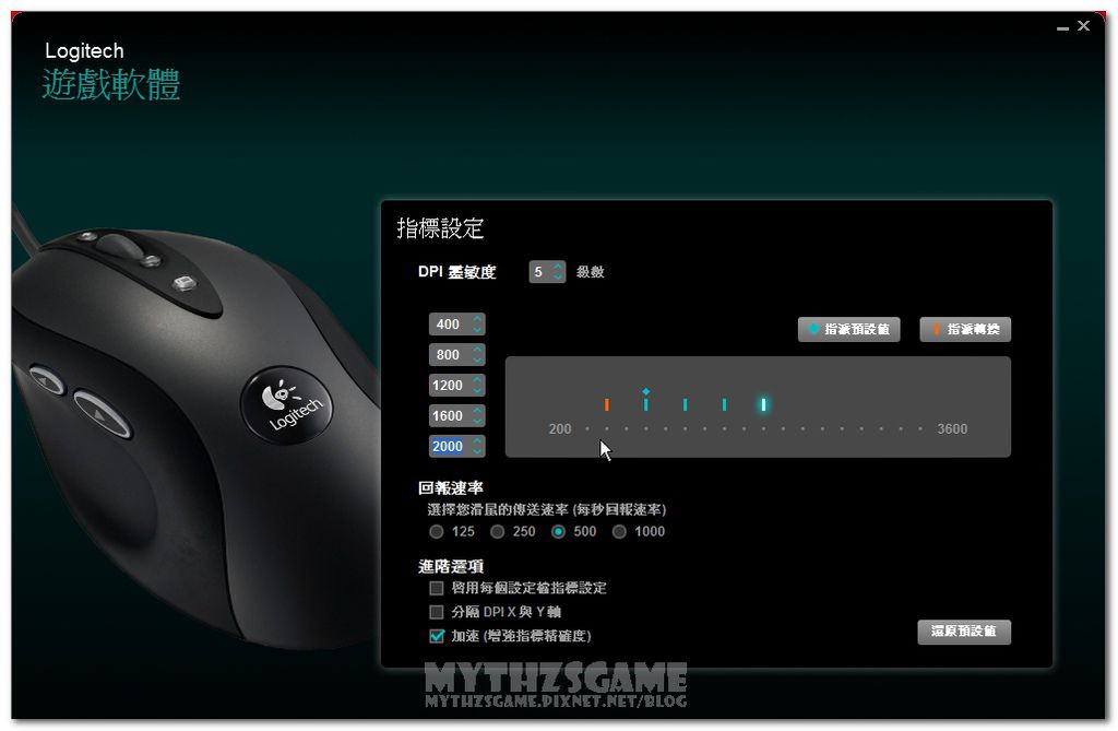 內建的4種靈敏度為400, 800, 1600, 3200 dpi 等4種靈敏度! 不過其實可以設到5種靈敏度,而且所有的靈敏度都可以依玩家需求另外設(200~3600dpi),某Z就改為400一階,這樣到時候要微調比較好調整。