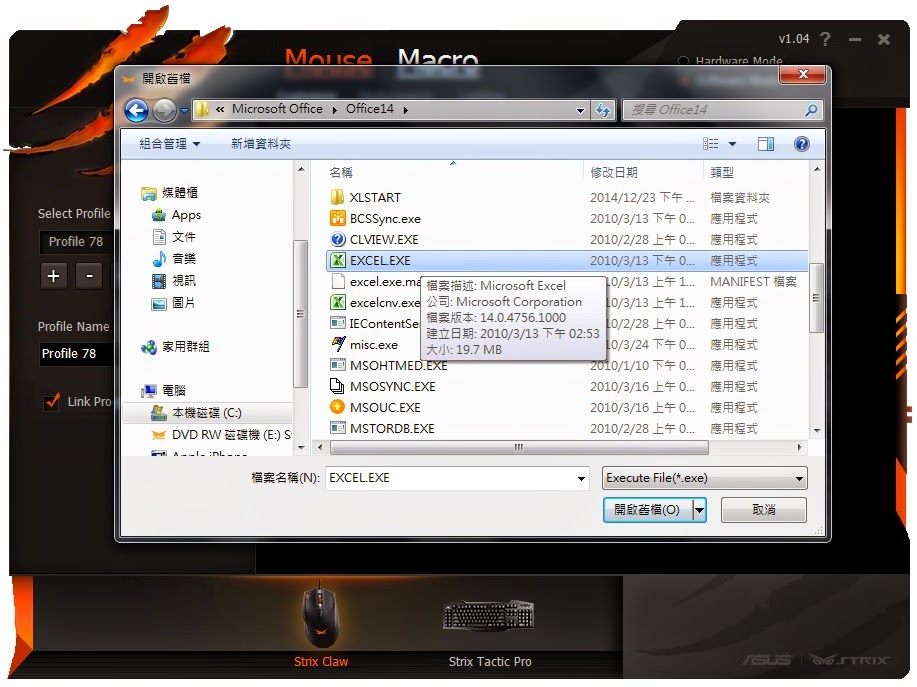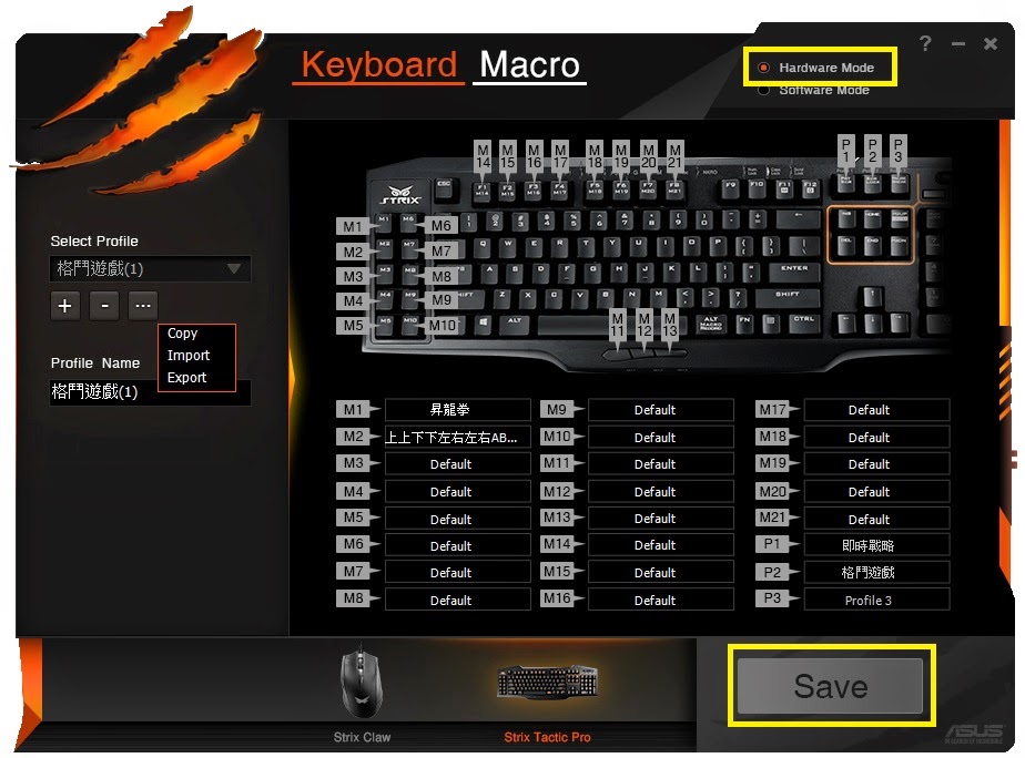 ▲ 設定完畢後,存檔方式與Strix Claw滑鼠相同,也有Hardware Mode,可將一組設定檔可以同步到鍵盤中。另外左邊Profile的Copy可以複製Profile的內容,方便做小調整,如把街頭快打複製到格鬥天王,Import跟Export分別可以匯入與匯出一整組的設定值到外部檔案中,附檔名為ini。將ini檔案帶到其他桌機再匯入,也是將Strix Claw與Tactic Pro攜帶到其他場合競技的方法之一。