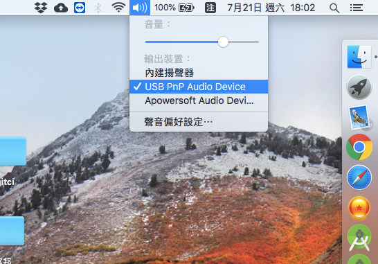 接上耳機之後,將聲音的輸出選到外接耳機即可