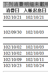 這是我信用卡帳單的日期,第一筆是自動轉帳繳款,才是消費日=入帳日,