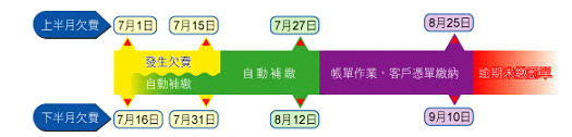 放暑假去了,不想理你們了,在此轉貼高公局欠費事項,有問題請問高公局,謝謝通行欠費補繳注意事項當用路人行經高速公路電子收費車道,因故未正常扣款繳納應繳通行費稱之”欠費”(包括ETC申裝戶及非申裝戶)。(一) 欠費補繳方式 (1)扣款失敗48小時後,您可於自動補繳期內,即欠費發生於15號前於當月27號內補繳,欠費發生於16號至月底於次月12號內補繳,至遠通直營門市補繳費用,免收手續費,但於其他通路補繳需給付通路商手續費。另eTag及全民體驗用戶可於自動補繳期內,至遠通直營門市或指定通路,以儲值方式免收手續費回扣欠費,但回扣欠費不能享有優惠費率。(補繳時程如下圖) (2)欠費逾自動補繳期,遠通電收亦會掛號寄出帳單至戶(車)籍地址(唯需酌收作業處理費50元),屆時請於繳款期限前攜帶帳單至全省四大超商(7-11、全家、OK、萊爾富)或 遠傳門市或 郵局 或 遠通公司直營門市補繳,亦可透過ATM轉帳完成欠費補繳作業。 (3)逾期帳單需請您前往遠通門市或致電遠通客服中心02-7716-1998刷卡補繳。(二) 作業處理費之收取依據 依據公路通行費徵收管理辦法第十五條規定「汽車通行於應繳通行費之公路,經收費站不依規定繳費者,徵收機關應向其追繳通行費及加收追繳作業費用,追繳作業費用包含車籍資料查詢費、照片費、帳單列印費、掛號郵資費、人工作業費及繳款手續費」。ETC營運公司依本局之委託辦理通行費之追繳並加收作業處理費50元。(三) 錯行車道之通行費繳付 ETC用戶(包含e通機、全民體驗、eTag)行駛ETC車道,應依各收費車種指定車道過站。小型車行駛大型車車道將依規定收取通行費50元。(四) 欠費未於期限內繳納之處罰 欠費經掛號通知補繳仍未於期限內繳納,將依道路交通管理處罰條例第27條,處汽車所有人或駕駛人新台幣3000元以上6000元以下罰鍰。(五) 交通違規單據寄送地點 依法令交通違規單據寄送地點為戶(車)籍地址,若不便異動地址,又要避免無法收取通知單,可至監理單位另登記通訊地址。(六) 對ETC通行費繳費通知單有疑義時,要如何申訴? 若對ETC通行費繳費通知單內容有所疑義,請檢附相關證明文件,於通知單所載繳款期限前,可電洽遠通客服中心02-7716-1998或親洽遠通公司直營門市填寫申訴單申訴。若對罰單內容有所疑義,請檢附相關證明文件,向通知單所載申訴單位(即事發收費站、車籍監理機關)提出申訴。(七) ETC用路人,使用電子收費車道,上高速公路前應確認帳戶餘額足夠支付當次通行費用,以防未扣款成功,產生事後欠費補繳之問題,如確知不能扣款,應改行人工收費車道。上架日期 2012/06/21資料提供單位:業務組本頁最後更新日期 2012/07/03欠費補繳時程示意圖
